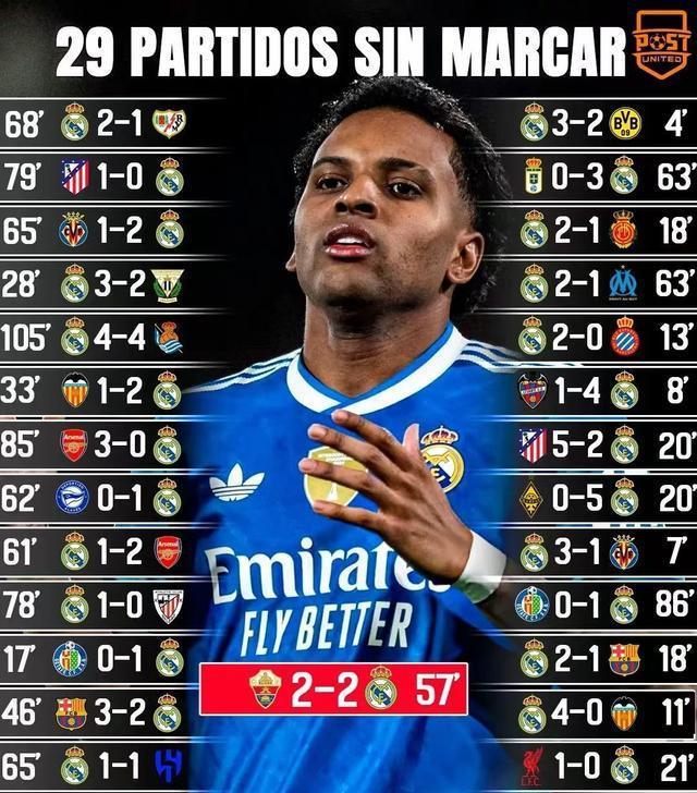 一场平局,将皇家马德里推到了一个微妙的境地,而队内的巴西前锋罗德里戈,则不幸成为了风暴的中心,他的名字与一个尴尬的队史纪录紧紧捆绑在了一起